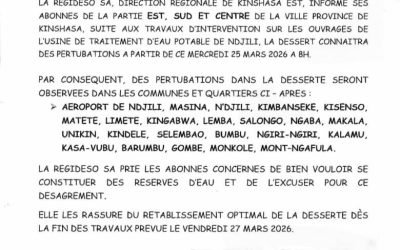 Kinshasa, 25 mars 2026 – Des perturbations dans la distribution d’eau potable ont été annoncées mercredi dans plusieurs communes de Kinshasa, capitale de la République démocratique du Congo, à la suite des travaux d’intervention en cours sur les installations de l’usine de traitement d’eau de N’djili. Selon un communiqué de la Régie de distribution…