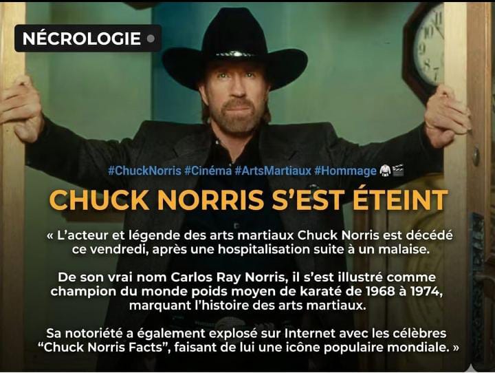 Monde : Mort de la Légende des Arts Martiaux Américains Chuck Norris ce Vendredi 20 Mars 2026 Suite à un Malaise