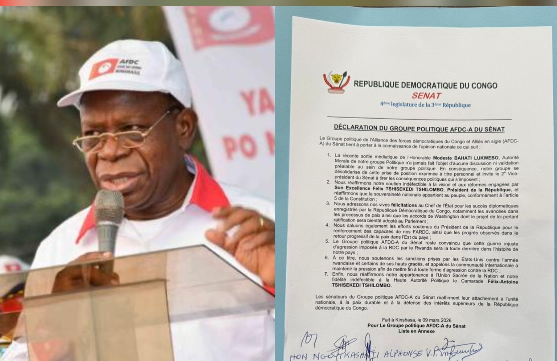 Le groupe politique AFDC-A au Sénat a effectivement pris ses distances avec les déclarations du sénateur Modeste Bahati Lukwebo, actuel deuxième vice-président de la chambre haute du Parlement, concernant la réforme constitutionnelle.